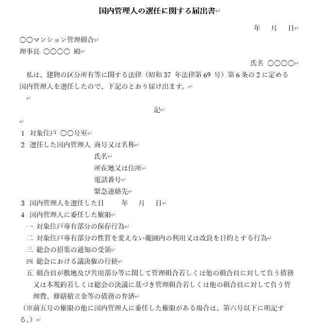 国土交通省のコメントでは、「組合員が国内に住所を有しない場合には、国内管理人を選任しなければならない」とする規約例を示しています。つまり、法律上は任意規定であるものの、管理規約により義務付けることが可能です。