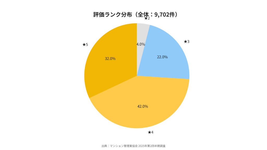 評価分布は★4が42%(4,080件)で最多、★5が32%(3,133件)、★3が22%(2,114件)。ワンストップサービス経由で「管理計画認定」を取得済みのマンションは2,081件に達しました。制度の裾野が広がり、上位評価(★4・★5)が全体の約7割を占める構図が定着してきたと言えます。