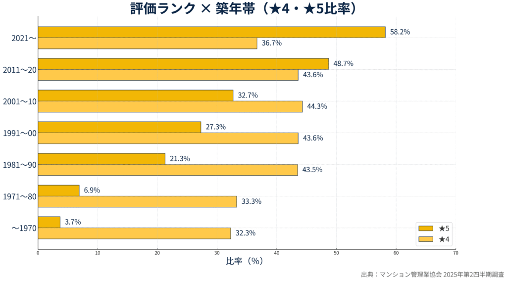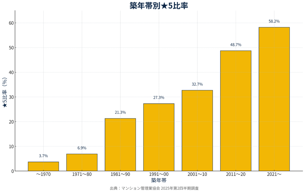 築年では2021年以降竣工が★5率58.2%と高水準。とはいえ1971〜1980年竣工の築古群でも★5が6.9%存在し、「築年=不利」を必然としないことも示唆されています。つまり、小規模・築古でも、要件を満たせば上位評価は狙える余地があるといえます。