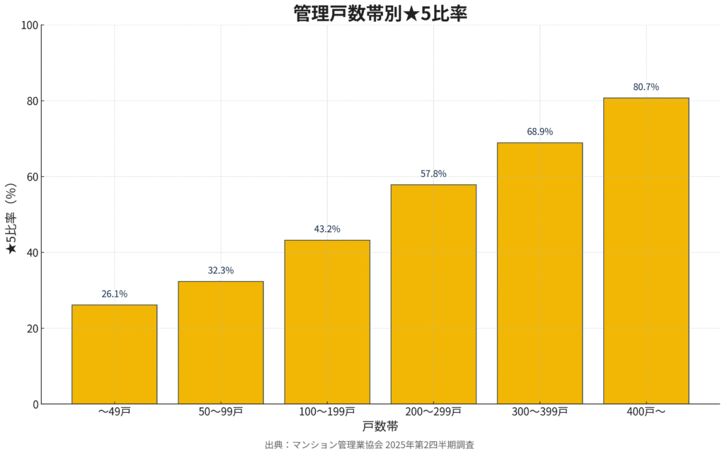 評価と属性の相関では、400戸以上の大規模マンションの★5率が80.7%と突出。一方で50戸未満は26.1%にとどまります。