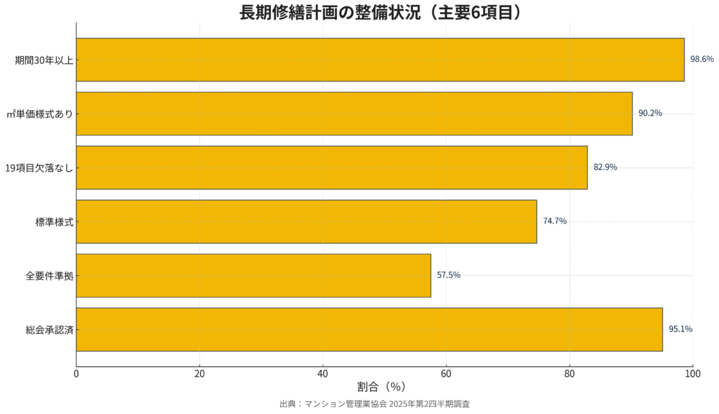 総会承認された計画の保有率は95.1%、うち全要件に準拠した計画は57.5%。標準様式への準拠は74.7%にとどまり、「推定修繕工事項目19項目の欠落」17.1%、「㎡単価様式の欠落」9.8%など、形式面の詰めが甘い例が残ります。計画期間は98.6%が30年で作成、最長は100年とロングレンジ化も進んでいます。
