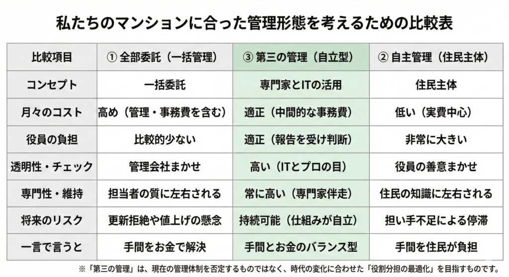 この両方を感じているマンションにとって、「第三の管理」は、極端に振り切らないための現実的な選択肢になり得ます。