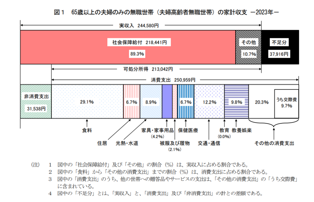 総務省の「家計調査(2023年)」によると、高齢夫婦無職世帯の「消費支出」は約25万円(住居費を含む)です。内訳を見ると住居費が約1.7万円のため、住居費を除いた実質的な生活費は約23万円となります。