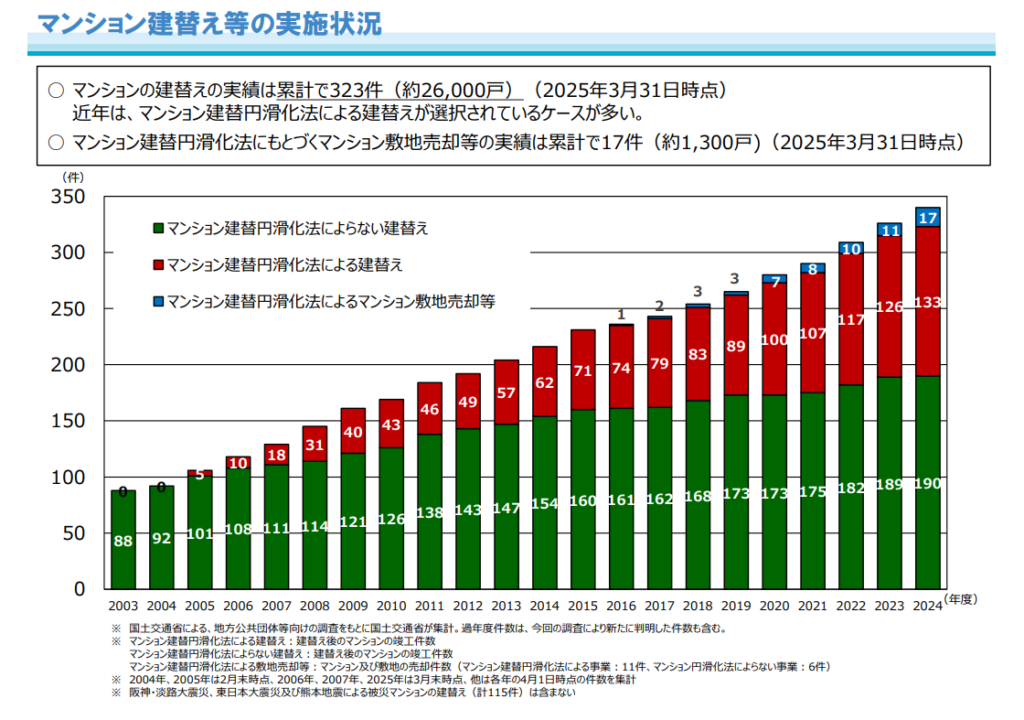 国土交通省の資料によれば、マンションの建替え実績は累計でも300件程度にとどまっています。築年数の進行に伴い老朽化マンションが急増している一方で、建替えが実現しているのはそのごく一部に過ぎないのが実情です。
