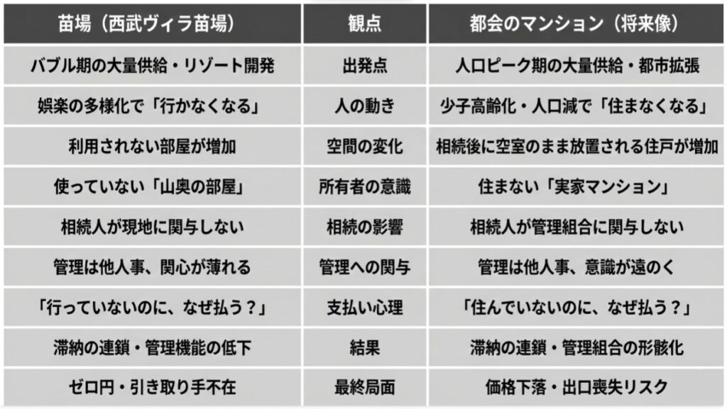 1970〜80年代に分譲されたリゾートマンションでは、相続をきっかけに、所有者が管理に関与しなくなるケースが生じやすい構造があります。都会でも同様です。都心近郊の古い物件を相続した子供が「自分は別の場所に家があるし、住むつもりもない」と考えたとき、意識は苗場のオーナーと完全に同期します。所有者が「住民」ではなく「部外者」になった瞬間、マンションの自治は崩壊を始めます。 - 「なぜ利用しないものに払うのか?」という心理的毒素
