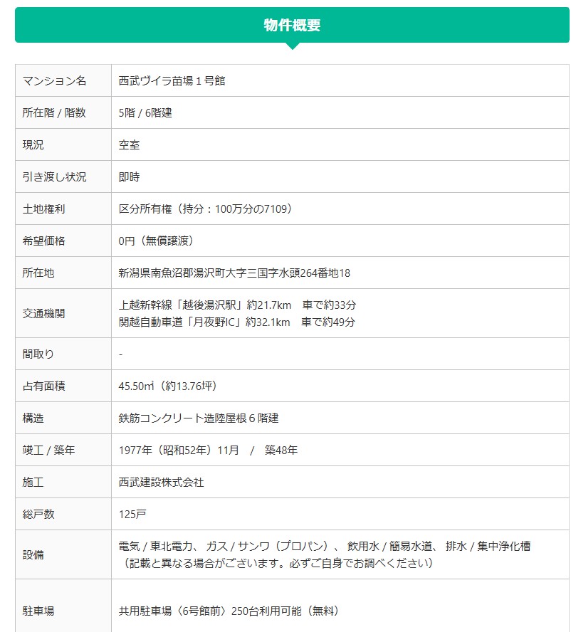 冒頭に掲示した「苗場スキー場近くのマンション一室が0円より」という物件概要の画像には、