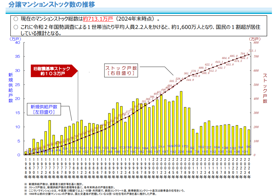 現在、日本国内に存在するマンションのストック戸数は700万戸を超えており、その数は年々増加しています。