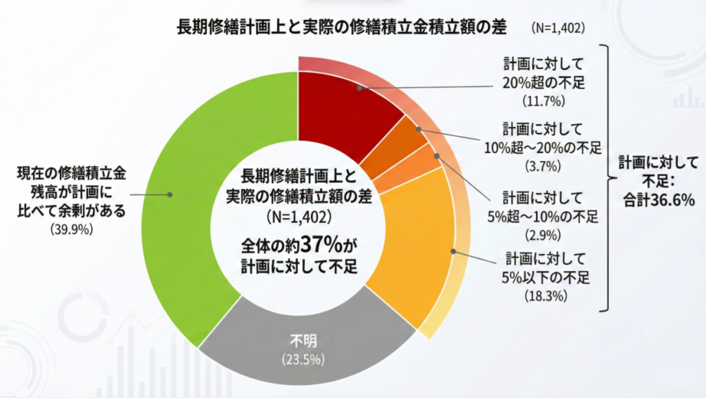 この背景にあるのは、国土交通省の「2023年度マンション総合調査」が示す深刻な統計データです。長期修繕計画に対して積立金が「不足している」と回答した組合は36.6%に上り、さらに「不明」と答えた23.5%を合わせると、全体の約6割のマンションが健全な資金計画を持っていない、あるいは現状を把握できていないことになります。この「不明」という回答の中には、実際には不足しているものの、理事会がその現実を直視できていないケースが多く含まれていると推測されます。
