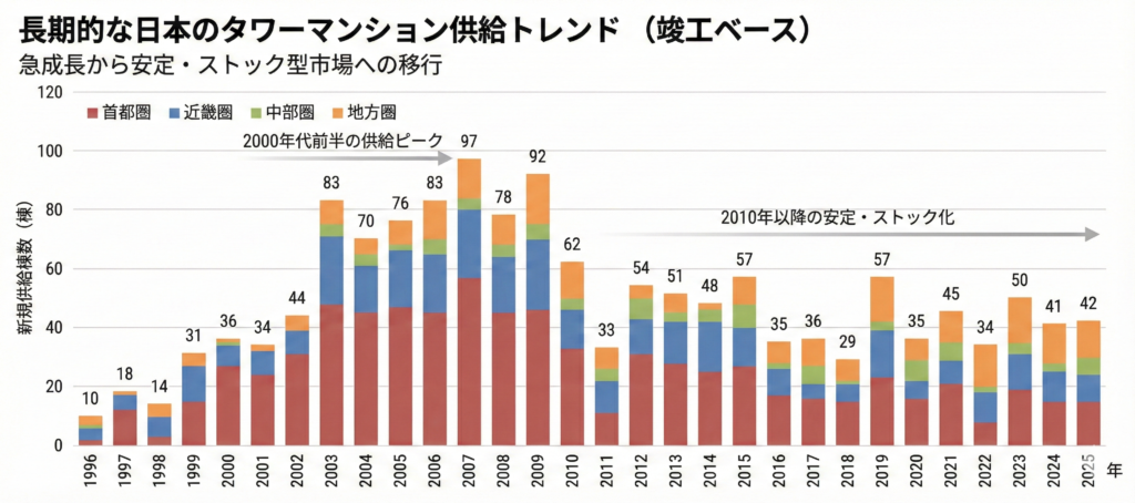 1996年から2025年までの日本のタワーマンション供給棟数の推移を地域別に示したグラフ。2000年代前半に供給ピークがあり、その後は供給が減少・安定し、ストック化が進んでいることを示している。